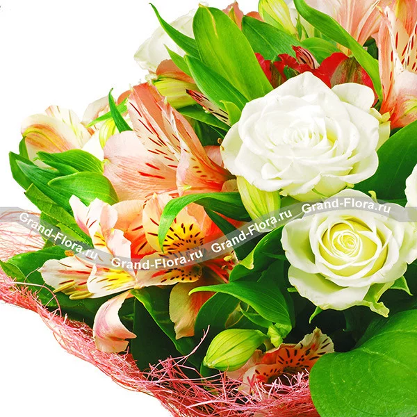 Легкость, романтичность, свобода – именно так можно охарактеризовать букет. Волшебные по своей красоте альстромерии и деликатные розы не кричат о громких чувствах, а дают едва уловимый намек. Дизайнеры соединили два цветка, которые вместе простоят долго в вазе, удачно дополняя друг друга цветом и запахом. Эта эффектная композиция в розово-белых тонах поднимет настроение имениннику, порадует прекрасную незнакомку, или станет началом новых отношений.